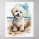 Cute Bichon Frise dog on the beach artwork in watercolor.