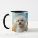 This cute mug celebrates the adorable Lhasa Bichon Frise dog! Two sides of the mug have a beautiful portrait of a little white Bichon Frise against a background splashed with colour, including orange, gold, and blue. At the centre is script that says Bichon Frise, but you may change it or even personalise it, if you wish. This mug will get noticed!