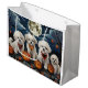Unleash the spooky spirit with this eerie Halloween design featuring a pack of dogs under a dark, moonlit sky, surrounded by flying bats and glowing pumpkins. Perfect for those who love a touch of frightful fun with their furry friends!