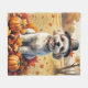 A watercolor-style painting of a cheerful dog sitting amidst a pile of vibrant fall leaves, surrounded by tiny pumpkins and scattered acorns. The dog wears a little pilgrim hat and beams with joy, capturing the spirit of Thanksgiving. In the background, soft harvest fields and golden-hued trees create a peaceful countryside ambiance. Gentle textures and warm, muted autumn tones give the scene a cosy, nostalgic feel perfect for celebrating the beauty of the season.