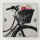 Stylish wall clock done in an antique linen look, with graphics of the front of a black bicycle, with it's basket holding colourful pink peony flowers. Lovely clock that makes a wonderful gift idea.