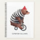 This design features a watercolor illustration of a bear on a bicycle wearing a striped sweater and red hat.