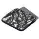 a high contrast black and white image of bicycles chained and D-locked to bicycle stands, creating a strong near abstract design of strong lines, curves and circles.