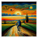 A.I .created print of a person rides a bicycle along a winding road within a surreal landscape of rolling fields and trees at sunset.