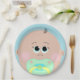 Blue baby shower paper plate, with graphics of a cute big cartoon face of a baby with a green pacifier. Customise to add your own text.