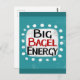 "Big Bagel Energy" is a cute text design in blue with black and red text, along with a white accent shape and white textured whimsical dots surrounding it.