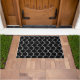 This doormat has an art deco design of white half circles connect with lines on a field of black.