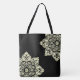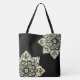 This big shoulder bag will add some pizzazz to your outfit not to mention your day. This wide and deep black bag has cheeky cream medallions peaking over the upper right and lower left corners. Want to add your name? SURE! If you like this, be sure to check out the coordinating yoga pants and phone cover.