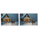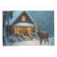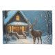Beautiful 12 point buck on a quiet snowy evening standing in front of a log cabin home with small twinkle lights in the trees an a homey lighted porch.