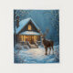 Beautiful 12 point buck on a quiet snowy evening standing in front of a log cabin home with small twinkle lights in the trees an a homey lighted porch.