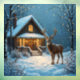 Beautiful 12 point buck on a quiet snowy evening standing in front of a log cabin home with small twinkle lights in the trees an a homey lighted porch.