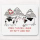 Humourous cartoon cows in an alpine pasture ask this loaded question with the Alps and Swiss flag in the background