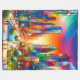 This fleece blanket has a skyscraper scene on it.