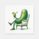 A humanoid pickle with a smiling face sits comfortably in an armchair holding a cocktail