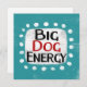 "Big Dog Energy" is a cute text design in blue with black and red text, along with a white accent shape and white textured whimsical dots surrounding it.