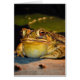 Close up macro photo of a big fat green and yellow Toad on a toadstool in a pond about to croak