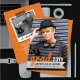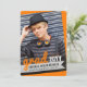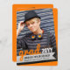 This modern graduation party invite design features a bold sketched/scribbled 'grad' script in orange, tilted at a stylish angle at the bottom of the layout matched with simple typography on a black gradient overlaying a personalised photo of the graduate.
