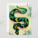 traditional watercolor artwork of a big green and black coloured snake on a postcard.