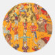 Japanese woodblock print vintage illustration of a big circus with acrobats and animals performing acts on an orange background.