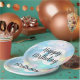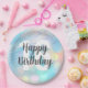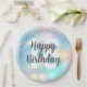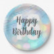 Custom party paper plates featuring pastel bokeh lights, clouds, and party beads with big editable birthday number and "Happy Birthday" in script lettering. Available in several sizes. See collection for matching items.