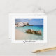 Postcard of the big rocks in the Mediterranean Sea at the sand beach of Cala Mariolu, situated near Cala Luna in the Gulf of Orosei on the island of Sardinia, Italy with Sardinia in black on a white background with the text: 'Sardinia'.