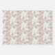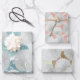Pretty white sand dollar patterned gift wrapping paper in sheets. All three sheets contain a similar pattern of realistic, white sand dollars. The first sheet contains of shades of blue, the second sheet is pink and white, and the third is tan and white.
