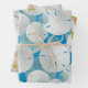 Pretty white sand dollar patterned gift wrapping paper in sheets. All three sheets contain a similar pattern of realistic, white sand dollars. The first sheet contains of shades of blue, the second, peach pink and green, and the third is tan and lavender.