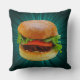 Novelty throw pillow for the foodie, with a picture of a delicious big sandwich burger. Bacon, lettuce and tomato on a bun, centred over a dark teal starburst background.