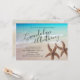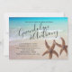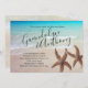 Modern beach wedding shower or engagement party invitations. The names of the bride and groom are in large script, angled at the top with two brown sea stars representing the couple. All party text is added in a paragraph so this card can be used for any type of party, or as a wedding ceremony invitation.