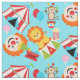 If you love the circus, bright colours, fun times, you'll love our Big Top Circus fabric featuring a sky blue background with the red, white, and blue striped big top tent, a lion, monkey juggling balls, popcorn, cotton candy, tickets, and clowns!