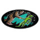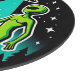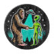 This whimsical image illustrates a friendly encounter between two legendary beings: Bigfoot and an alien. The scene, set against a starry night sky with silhouettes of pine trees, shows Bigfoot and the alien shaking hands under the beam of a UFO hovering above. Bigfoot, covered in brown fur, stands on the left while the green, humanoid alien with a large head and black eyes stands on the right. The combination of these iconic figures in a peaceful meeting adds a playful twist to both myths, making it a fascinating and humourous piece for enthusiasts of the unexplained.