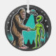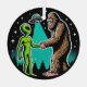 This whimsical image illustrates a friendly encounter between two legendary beings: Bigfoot and an alien. The scene, set against a starry night sky with silhouettes of pine trees, shows Bigfoot and the alien shaking hands under the beam of a UFO hovering above. Bigfoot, covered in brown fur, stands on the left while the green, humanoid alien with a large head and black eyes stands on the right. The combination of these iconic figures in a peaceful meeting adds a playful twist to both myths, making it a fascinating and humourous piece for enthusiasts of the unexplained.