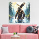 Bigfoot canvas wall art. A muscular Sasquatch with an eagle landing on his shoulder while he wades through a river in a forest.