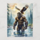 Bigfoot postcard. A muscular Sasquatch with an eagle landing on his shoulder while he wades through a river in a forest.