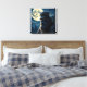 Bigfoot canvas art. A Sasquatch with golden glowing eyes with an owl on his shoulder with a Full Moon forest background in shades of blue.