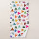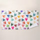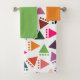 This towel set has an orange washcloth, a green hand towel, and a bath towel with a Boho design of bigger triangles with dots scattered about the design in Boho colours.