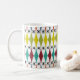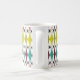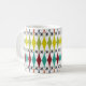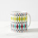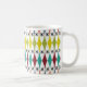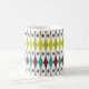 This mug has a mid-century modern design of stretched diamonds and starbursts on a field of white.