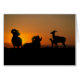 A small herd of bighorn sheep settle down for the night. Their silhouettes stand against the blazing sunset behind them. Computer art by Kathie Miller.