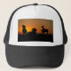 A small herd of bighorn sheep settle down for the night. Their silhouettes stand against the blazing sunset behind them. Computer art by Kathie Miller.