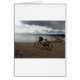 A bicycle on the beach. A bicyclist stops and gets off his bike to go fishing on an old crumbled pier off San Francisco Bay.