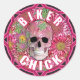 Biker chick set in a flowery circle surrounded by a tribal design. Great looking apparel for lady bikers.