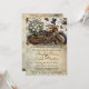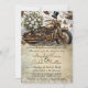 This invitation features a gold motorcycle with steampunk elements, white roses, doves, and angel wings. All text is editable to customize to your own wording.