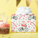 Cyclist Christmas holiday gift wrap or party decoration featuring cartoon Mrs. Claus cycling surrounded by holiday candy.