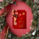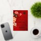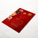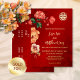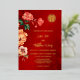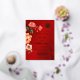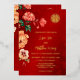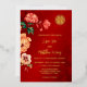 This traditional Chinese wedding invitation features a real gold foil and red double happiness symbol and painted orange apricot peonies on a red shimmering background. Bride and groom names in an elegant handwritten script in real gold foil. Chinese wedding invitation or tea ceremony invitation with a traditional Chinese text on the backside.