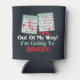 Fun and funny gambling saying / quote design for Bingo Players and Bingo Lovers: "Out of My Way! I'm Going To BINGO!" slogan humour. With blue cards and red bingo daubers marker design. Don't miss the early bird games! For anyone hooked on the Bingo game and loves playing bingo.
