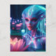 An alien swims in a pond at night with bio-luminescent glowing flowers.