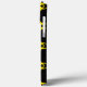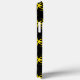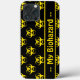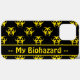 Black cell phone case with bright yellow biohazard symbol pattern and customisable text field. Personalise with a name or other text or text symbols.