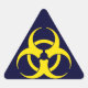 Dark blue triangle sticker with a bright yellow biohazard warning symbol.
