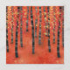 A modern landscape painting of a birch or aspen tree forest in the autumn in rich tones of red, orange and yellow.
