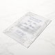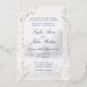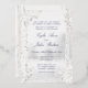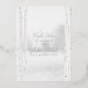 A soft white and silver foil birch tree forest wedding invitation featuring a foggy forest woodland background with pure white birch trees in the foreground adorned with white peonies and silver dollar eucalyptus greenery. Bride and Groom's parents invite the guests with your names in a classic modernised wedding script in silver foil. The back of the invite looks more like the cover and features the Bride and Groom's first name and surnames in a silver grey font. The back is not silver foil.